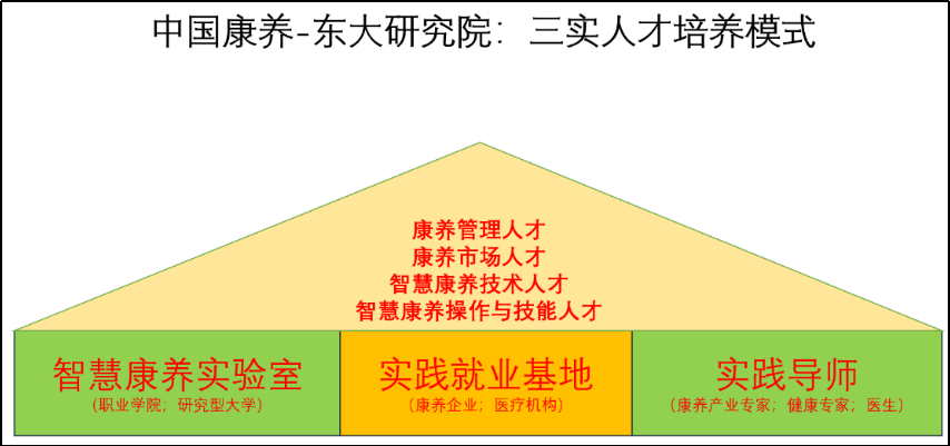三实:即学校理论学习基础上的“实验室+实习基地+实践导师”三位一体的康养人才创新培养模式。不断完善人才实践培养体系制度与机制,为国家培养有追求、能做事的战略型康养人才。