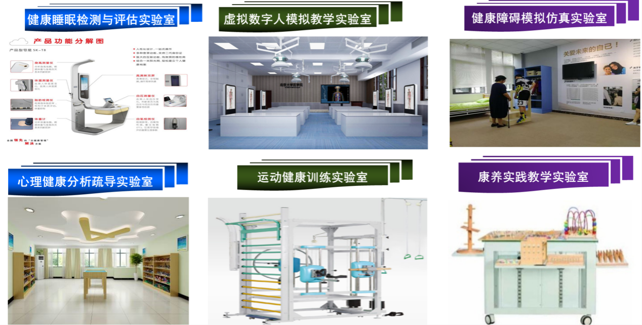 健康服务与管理专业实验室目前拥有数字化智慧OT评估与训练系统、平衡功能检查训练系统、虚拟数字人解剖系统、主动运动综合康复训练系统、健康管理模拟沙盘实训平台软件、精神压力评测分析仪、脉冲磁睡眠治疗机和红细胞数字分析仪。由此构成健康睡眠检测与评估、虚拟数字模拟教学、健康障碍模拟康复、心理健康分析疏导、运动健康训练、康养实践教学等六个特色化康养实验室。总面积达到500平米,设备资产达近1000万,学生全面掌握康养相关技能提供重要硬件支撑。